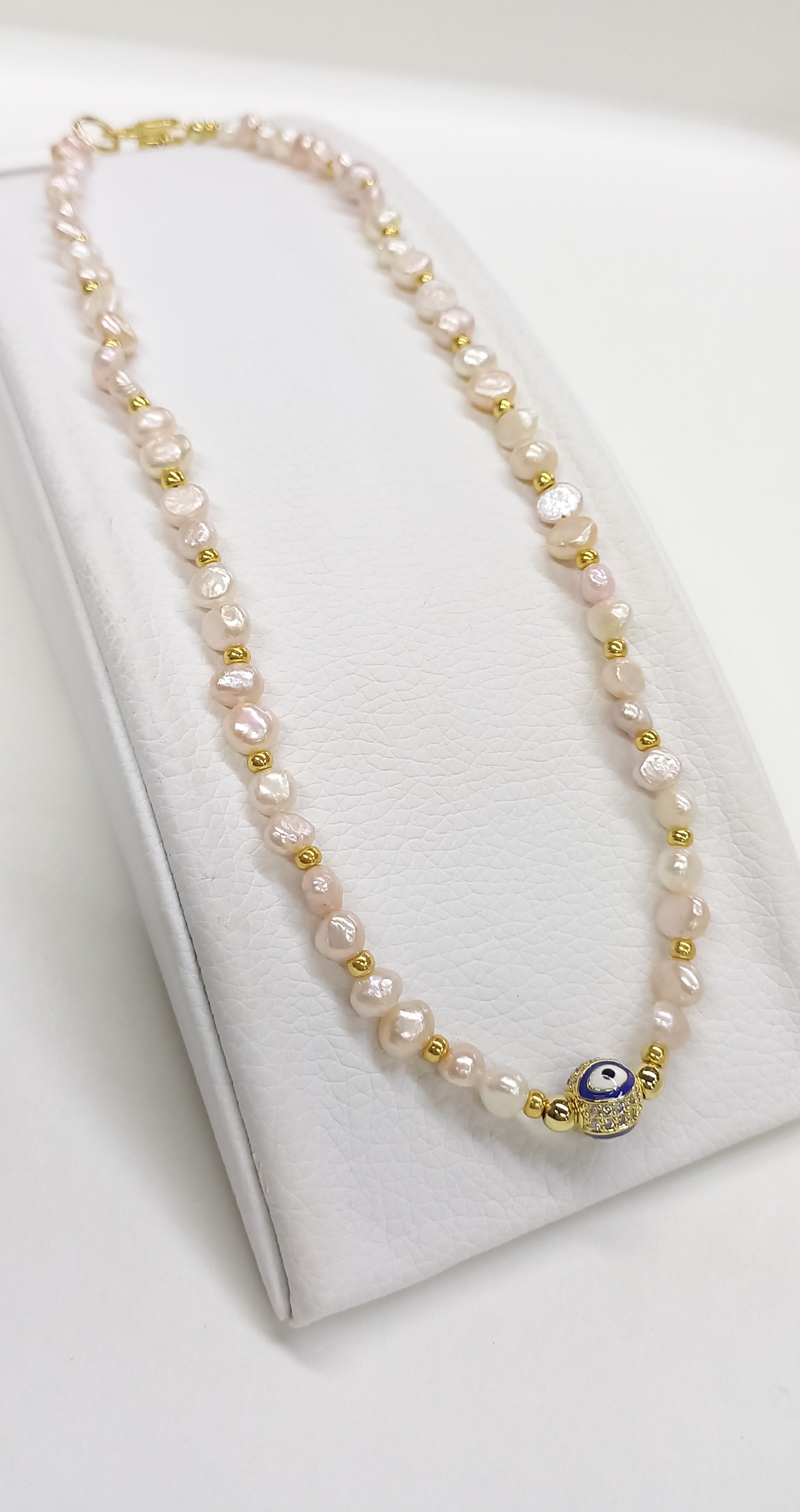 Collar de perlas cultivadas (de agua dulce) con rondel de Ojo Turco con baño de oro 24k.