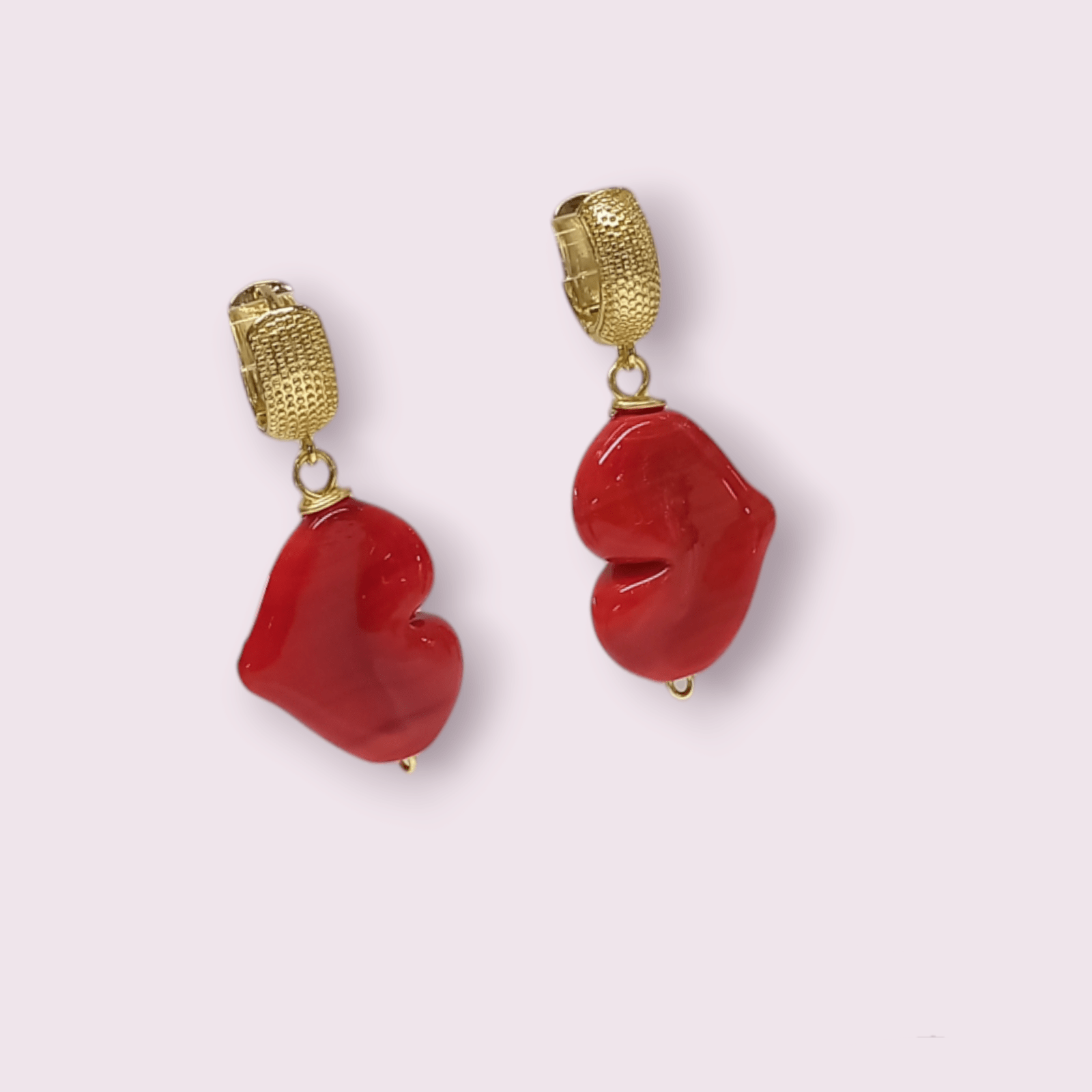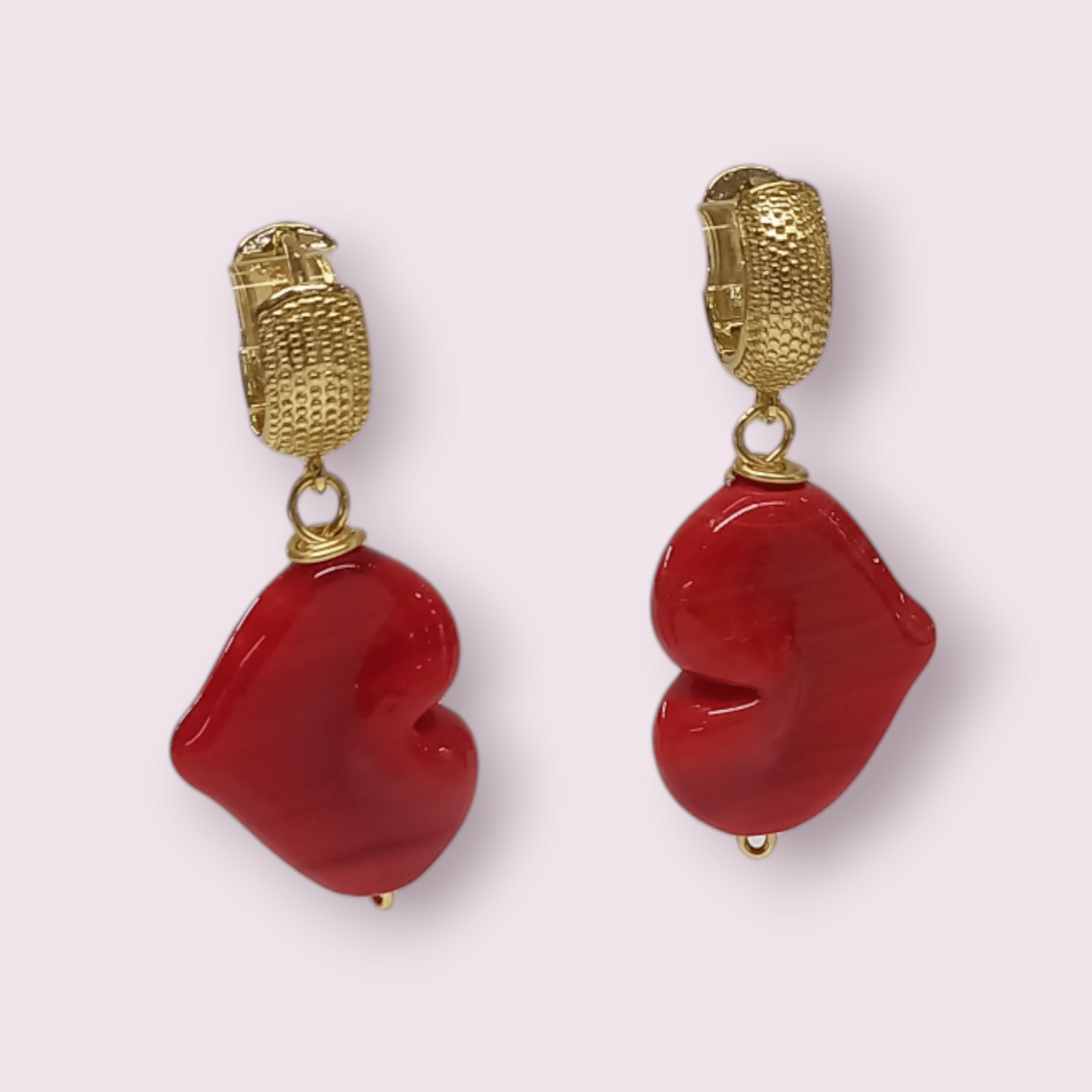 Zarcillos estilo argollas y delicado Corazón de murano (vitral). diseñados en baño de oro 24k .(silver plated gold)